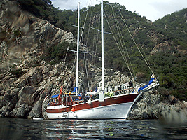 Ein Tauchboot begleitete uns bei unserer Fahrt in westlicher Richtung entlang der türkischen Ägäisküste, die außer Felsen, Gestrüpp, einzelnen Ziegen und halbwilden Eseln nicht wirklich viel zu bieten hat. Zum Flaschenfüllen begab sich das Tauchboot stets in eine andere Bucht, oder zumindest in einige Entfernung von unserem Schiff, damit wir nicht vom Kompressorenlärm belästigt wurden. Zudem konnten wir Tauchplätze, an denen wir nicht direkt mit unserem Schiff ankern konnten, dann mit dem kleinen Tauchboot anfahren, das uns auch bei einzelnen Tauchgängen wieder bei unserer Aufstiegstelle aufsammelte und zurückbrachte.