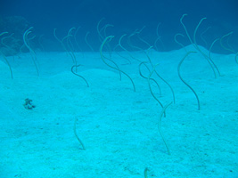 Auf einer Höhe von ungefähr 5 Metern kommen wir auf ein weites Sandplateau und im hellen Licht der Morgensonne erkennen wir, dass hier Hunderte von Röhrenaalen sich in der leichten Strömung sachte hin und her wiegen. Nur nicht zu nahe kommen, sonst sind sie binnen Sekunden weg!