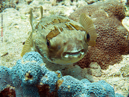 Das ist phänomenal: Kaum ein Tauchplatz ist tiefer als 20m, Strömungen sind selten. Damit kann der geneigte Taucher sich völlig auf das konzentrieren, was um ihn herum ist, ein Unterwasserparadies aus Weichkorallen, Acroporas, Tischkorallen in pastell-Farben aus den verschiedensten Braun-, Grün-, Rosa-, und Fliedertönen bis hin zu einem leuchtenden dunklen Lila. Die Sicht reichte zu unserer Zeit von 15-20m, was vielen gering erscheinen wird, aber was haben wir nicht alles gesehen! Denn das nährstoffreiche Wasser sorgt nicht nur für Eintrübung, sondern vor allem lockt es auch riesige Fischschwärme aus hunderten von Fischen einer Art an, die einen wie eine bewegliche Wand über Minuten hinweg umringen. Aber nicht nur Fische gibt es hier unendlich, auch Schildkröten und Muränen – an einem Tauchplatz (gleich vor der Marina) zählten wir zum Nachttauchgang über 20 Tiere. An einem anderen gelang es uns einen Schwarzspitzenriffhai zu begegnen. Sepien, die ihre Gelege bewachen, Schnecken beim Weiden, vereinzelt Rochen, viele viele Rotfeuerfische, Barakuda-Schwärme und immer wieder Schulen von Füsilieren und anderen Schwarmfischen.