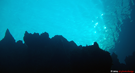 Der Einstieg übrigens ist von einer kleinen Holzplattform über eine Stufe möglich. Am besten das Jacket aufpumpen, ins Wasser werfen, dann selber im Wasser die Flossen anziehen, ins Wasser gleiten und das Jacket überstülpen – alles andere ist zu eng, unbequem und zu gefährlich – insbesondere, wenn sehr viele Touristen und Taucher gleichzeitig sich durch den engen Zugang zwängen wollen.