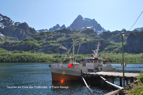 2 Tage gehen schnell vorbei und die Gruppe wollte weiter bleiben. Leider war es nicht möglich, denn ein Safarischiff war gechartert und es waren Sightseeing und Tauchen die nächsten Programmpunkte. 2 Tage mit einem Safarischiff unterwegs, d.h. heißt dann auf kleinem Raum wohnen und auf gutes Wetter hoffen. Natürlich war der Wettergott uns wohlgesonnen, so dass die Fahrt zum Raftsund, Tauchen am Hurtigrutendampfer „Nordstjernen“ und die Weiterfahrt zum Trollfjord mit einem Tauchgang, zu einem unvergesslichen Erlebnis wurden. Übernachtungen auf dem Schiff, bei Top-Wetter Fahrt durch Raftsund, vor der gigantischen Kulisse der Bergwelt der Lofoten und die Mitternachtssonne beobachten, runden diese Tage ab.